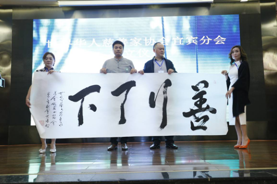 世界华人慈善家协会峨眉山分会会长、著名书法家朱继文捐赠书法作品《让慈善成为习惯》