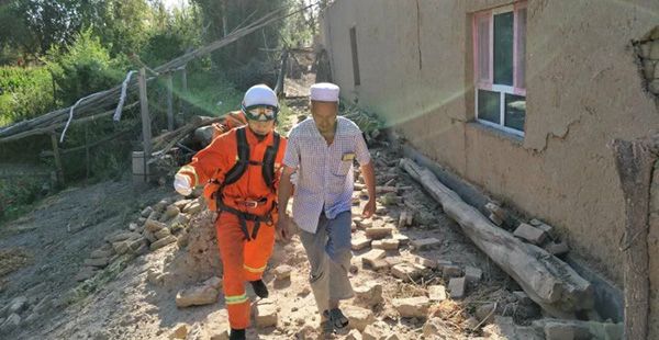 新疆消防官兵第一时间赶到震中地区开始展开搜救工作,并及时将群众转移到安全地带。