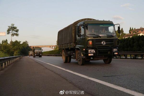 8月9日凌晨,西部战区陆军第77集团军440名官兵、36台车辆组成的第一梯队救援官兵星夜赶赴灾区。@军报记者图