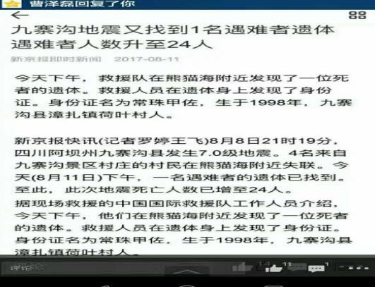 昨天(8月11日)下午,一名遇难者的遗体已找到。至此,此次地震死亡人数已增至24人。现场救援的中国国际救援队工作人员介绍,今天下午,他们在熊猫海附近发现了一位死者的遗体。救援人员在遗体身上发现了身份证。身份证名为常珠甲佐,生于1998年,九寨沟县漳扎镇荷叶村人。新京报记者了解到,19岁的常珠甲佐今年刚刚高中毕业,被西南财经大学天府学院录取。如果不出意外,他将在九月成为一名大学新生。