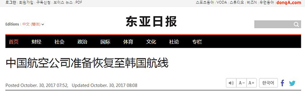 环球网10月30日报道,“中国航空公司准备恢复至韩国航线”的消息30日登上了韩国《东亚日报》以及《亚洲经济》等网站的首页。