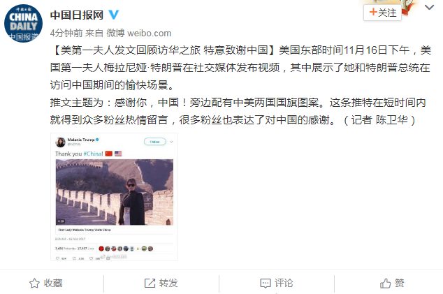 据中国日报官方微博11月17日消息美国东部时间11月16日下午,美国第一夫人梅拉尼娅·特朗普在社交媒体发布视频,其中展示了她和特朗普总统在访问中国期间的愉快场景。推文主题为:感谢你,中国!旁边配有中美两国国旗图案。这条推特在短时间内就得到众多粉丝热情留言,很多粉丝也表达了对中国的感谢。(记者陈卫华)