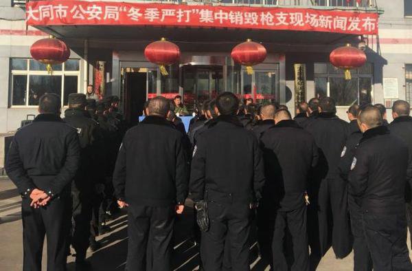在集中销毁行动中,大同市公安局共销毁近年来报废公务用枪及收缴的各类非法枪支872支,其中,报废公务用枪54式手枪133支,64式手枪1支,77式手枪3支,85式冲锋枪1支,97式防暴枪72支,体校训练用枪50支,非法土制猎枪612支,管制刀具2453把,弓弩21支。