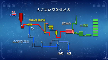 中洁蓝飞灰处理工艺主要包括循环梯度洗涤除CI-、洗水MVR蒸发分盐和水泥窑协同处置三个阶段,经过洗涤除氯后的飞灰,通过输送设备密封管道直接输送到窑尾1300℃高温段,进入水泥窑煅烧。处理过程中二恶英被完全分解,且不具备二次合成条件,重金属能被有效固定在水泥熟料晶格中,对熟料产品质量及大气环境未造成影响,并且有效缓解了结皮和腐蚀的问题,废水经过MVR蒸发分质结晶,制成工业级的氯化钠和氯化钾,实现了飞灰的无害化与资源化处理。