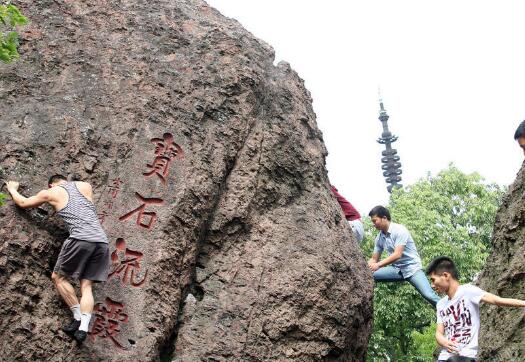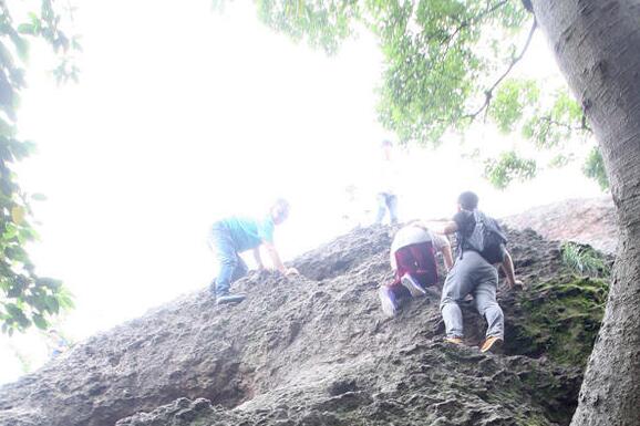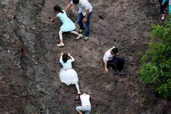 西湖宝石山游客之多,无处落脚,有个别山道道路拥堵,一些游客便开始冒险爬崖走近道,更有家长带着小孩冒险。