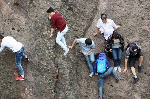 游客爬崖抄近道,更有家长带着小孩冒险: