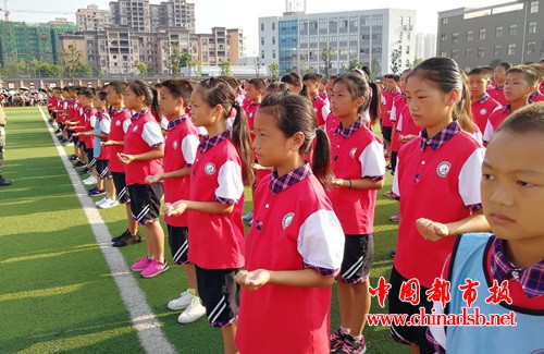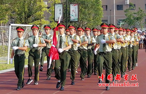 汇演场上1050名新生身着鲜艳的新校服的同学正一边喊着口号,一边做着规范、标准的动作。升旗仪式上,学校国旗护卫队威武的姿势真有军人的风范,让同学们体验到了军人保家卫国的职责,激发了他们的爱国情怀。仪式上举行了开班建班仪式、小组合作训练、团队建设训练、德育常规教育、路队文化训练汇演。