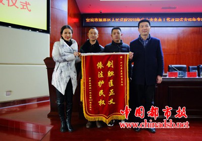 农民工代表在宜宾市翠屏区法院向宜宾市翠屏区法律援助中心敬献锦旗(摄影卫智健)