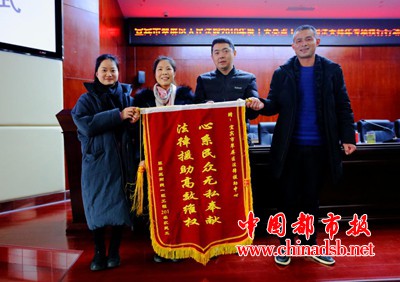 农民工代表在宜宾市翠屏区法院向四川舟度律师事务所敬献锦旗(摄影卫智健)