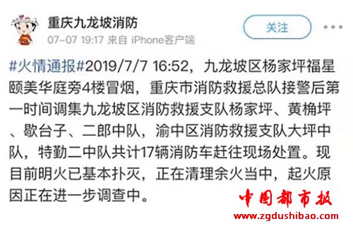 7月7日下午,多段关于重庆九龙坡区滩子口一老式居民楼起火的视频在网上传播。当日19时左右,重庆市九龙坡区消防救援支队官方微博发布一则火情通报称,7月7日16时52分,九龙坡区杨家坪福星颐美华庭旁4楼冒烟,目前明火已基本扑灭,正在清理余火当中,起火原因正在进一步调查中。