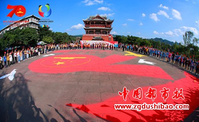 中国都市报讯(记者郭旭东报道) 9月25日,由中共成都市龙泉驿区委组织部、龙泉驿区委宣传部、中共成都经开区工委社治委指导,龙泉驿区总工会、共青团龙泉驿区委员会、龙泉驿区妇女联合会主办,成都天地人善雅文化传播有限公司承办,洛带镇人民政府、龙泉驿区融媒体中心、成都市洛带中学校协办的龙泉驿区庆祝新中国成立70周年大型地面沙画、快闪活动在洛带古镇五凤楼广场举行,上百名党员、团员干部以及社区干部、群众、中学生和现场游客一道向祖国真情“表白”。