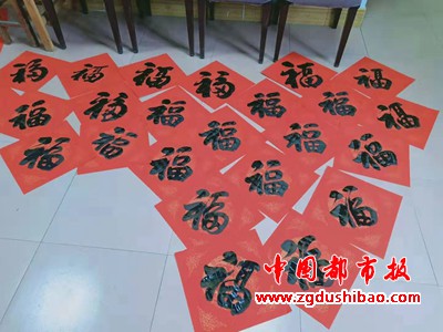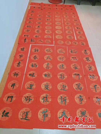 在村委会议室现场,书法爱好者浸墨挥毫,笔走龙蛇,行云流水间, 一幅幅寓意平安和谐、吉祥如意的春联便随笔而出、一气呵成,楷书、行书、隶书等字体的春联,寄托着人们对即将到来的新年的憧憬和向往。义写春联活动持续了3个多小时,现场为村民“义写春联”100余副,受到了村民的热烈欢迎。