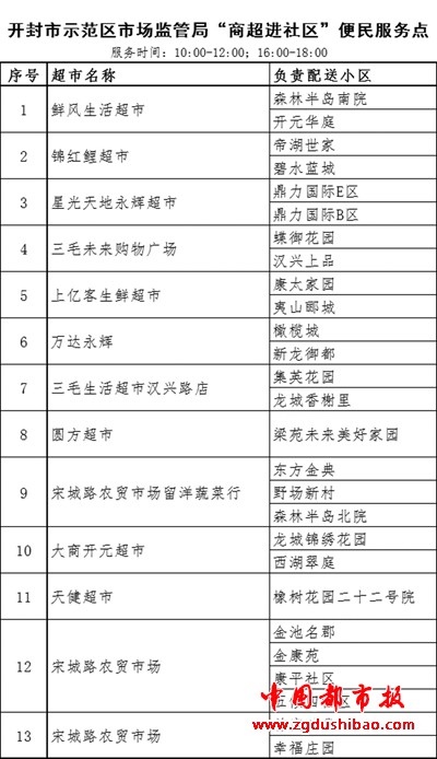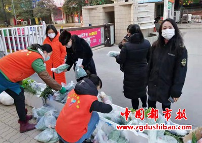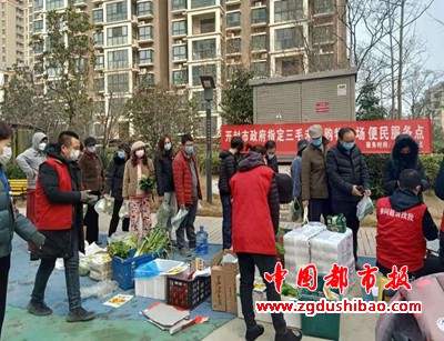 开封市市场监管局副调研员、示范区分局党组书记杜艳辉、局长陈报春亲临一线,联系协调各办事处在和小区物业,组织各超市、蔬菜商行设立便民服务站点,每天上午10点到12点,下午4点到6点到承诺配送的小区配送平价米、面、蔬菜等基本生活物资,即方便了群众购买需求,又减少人员在外的滞留和交叉感染,为示范区打赢疫情防控狙击战夯实了基础。