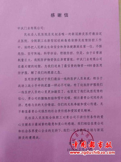 民权县人民医院是该县唯一的新冠肺炎收治定点医院,2月10日,当400套防护服送到该院发热病区护士长李青手中的时候,李青留下了激动的眼泪:“我院库存的也仅剩下20余套,有了这批防护服我们一线医护人员的心里更加踏实了,也坚定了我们战胜疫情的信心”该院业务院长杲金良说:“医用防护服对于我们救治一线的医护人员来说,相当于战场上战士手中的武器一样必不可缺,感谢闫鹏洋先生的善举,解了我们的燃眉之急,可谓是雪中送炭。”