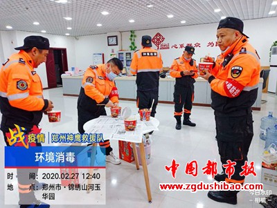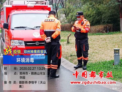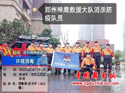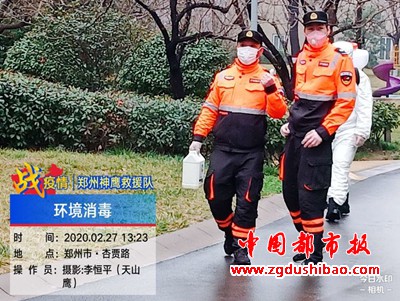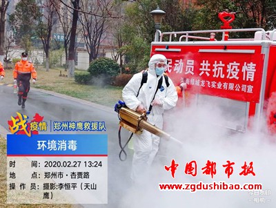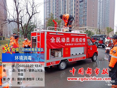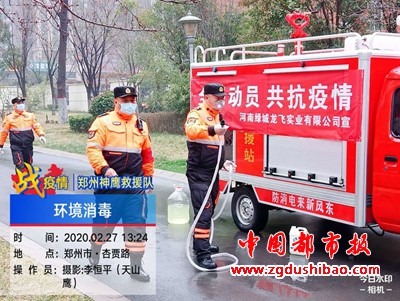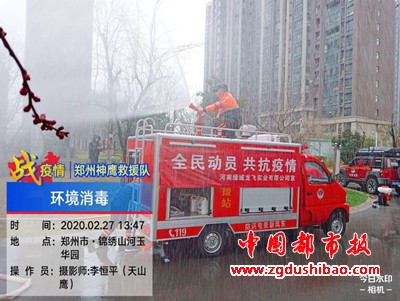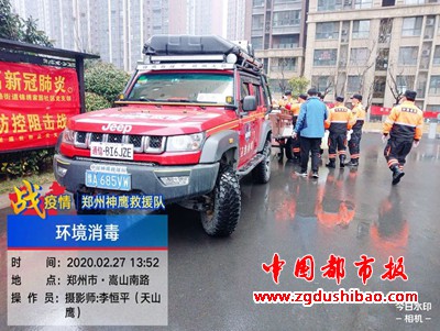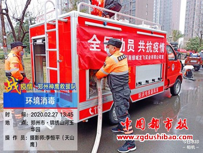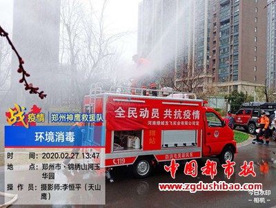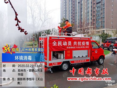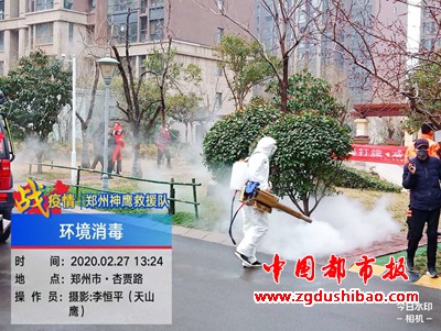 本报讯(记者袁宏太 通讯员田聚成 李恒平)郑州报道:2020年2月27日下午,郑州神鹰救援大队,大队长邢军带来队员,对嵩山南路办事处锦绣社区进行义务消杀五万多平方。