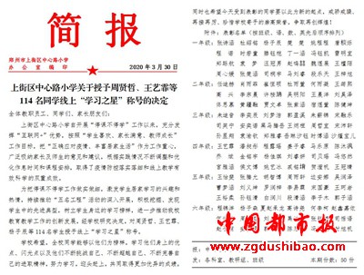 本报讯(记者李国杰 通讯员李鹏图)郑州报道:“学校希望,全校同学能够以他们为榜样,学习他们身上的优点、闪光点以及……”3月30日,正值上街区中心路小学开展线上教学第八周的星期一,学校像以往正常开学一样通过网络举行优秀学生表彰活动。