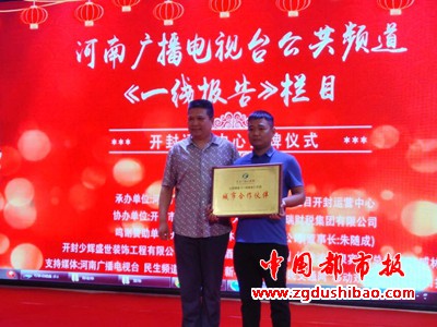 《一线报告》栏目总制片人王福健现场为开封运营中心负责人时纪波颁发合作伙伴牌匾,他在致辞中对栏目在开封的运营提出了设想与未来远景规划。