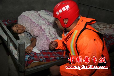 7月24日一大早,在蒙洼蓄洪区一名病重被困群众家中,前来转运群众就医的河南航空港消防救援支队抗洪抢险突击队指挥员侯方趴在生病群众床前,亲切与生病群众交谈,打消群众心中顾虑,使其安心看病就医。