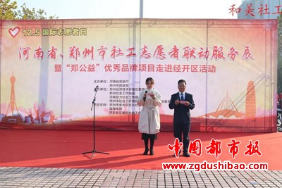 本报讯(记者许金明 通讯员王艳红 王丽)河南报道: 上午9:30,由河南省民政厅,郑州市民政局主办的河南省、郑州市社工志愿者联动服务展暨“郑公益”优秀社工服务项目走进经开区品牌推介活动在郑东新区经开广场举行。和美社工带着“父母教案——成长支持方略”和“美言礼仪赋能”两个项目参与活动,和美社工理事长陈建鹏应邀主持此次活