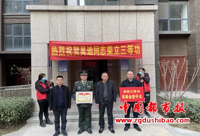 吴迪同志因工作突出2020年荣立三等功一次。“孩子能在部队立功受奖实属不易!这是你们家的光荣,也是全市人民的荣誉,孩子事迹多次受到部队的奖励!”荥阳市人武部政委李增辉,退役军人事务局局长王书俊,京城街道办书记张建东等一行六人将立功喜报交到吴迪父亲手中。“谢谢,谢谢,领导亲自给我们家登门送喜报,我们真是太荣幸了!”吴迪父亲笑得合不拢嘴。