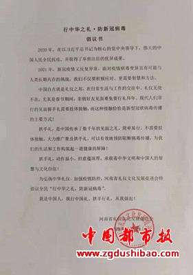 本报讯(记者仓超)郑州报道:农历腊月二十三小年刚过,一则“行中华之礼,防新冠病毒”的倡议书(信息)便在手机微信圈里广泛流传,短短几天,便有数千名文化学者、大学教授、传媒人士、以及热爱中国优秀传统文化的企事业家和各界人士,纷纷相告并相互转发这一倡议书,有的干脆直接发来自己的拱手礼图片,以示响应和支持。