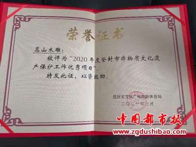 本报讯(记者仓超)登封报道:3月16日上午,在登封中州华鼎饭店召开的登封市文化广电旅游体育文物工作会议上,总结表彰了登封市2020年度文化广电旅游体育产业发展突出贡献奖、文化广电旅游体育工作先进单位、A级景区创建先进乡镇、全民健身工作先进单位、文化广电旅游体育服务保障工作先进单位、登封市非物质文化遗产保护工作优秀项目和优秀传承人、文化创意先进单位等。其中,非物质文化遗产项目嵩山木雕荣获:2020度登封市非物质文化遗产保护工作优秀项目和优秀传承人荣誉称号。