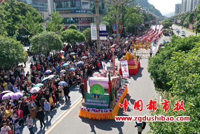 早上8:30,民族民俗巡游队伍从兴文县城石海广场出发,前往光明新城市民广场。巡游队伍的成员们身着民族盛装,一路上与人们挥手互动,各乡镇方队融入了本乡镇的文化、产业等元素,吸引了广大游客和市民一路跟随。