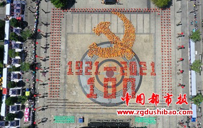 快闪活动从无人机的视角可以看到,演员们有序变换队形,运用色彩元素,分别呈现了党徽、红星、花朵、数字等图案,庆祝中国共产党成立100周年。