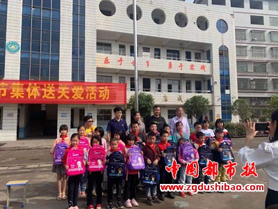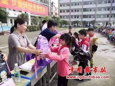 活动第四项,与会领导代表镇党委、镇工会联合会给品学兼优家境困难的留守送关爱(发慰问品),并合影留念。