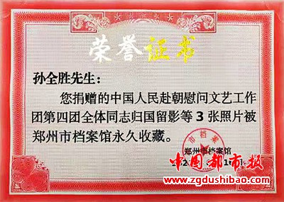 70 年后的今天,世界面临百年未有之大变局,国际局势风云变幻,国际战略格局发生重大变化,我国国家安全和人民利益面临新的严峻挑战。不忘初心,牢记使命。全面回顾中国共产党领导抗美援朝战争的光辉历程和宝贵经验,深刻挖掘抗美援朝精神的丰富内涵和时代价值,在新时代汲取战略决策的精髓和智慧,继承和弘扬抗美援朝精神,为实现中华民族伟大复兴而奋斗,具有十分重大的历史意义和现实意义。正是基于此因,近日在恒安标准人寿郑州本部总经理刘春燕女士的大力推荐下,民进河南省委员会第一任组织部宣传负责人孙全胜先生将自己母亲李香英女士(已故),当年赴朝参加慰问抗美援朝志愿军战士时的有关照片资料捐赠给了郑州市档案馆,于6月16日上午在郑州市档案馆一楼大厅举行了捐赠仪式。1952年,李香英参加由中南局组织的赴朝慰问团。到朝鲜后,经常冒着敌人的炮火,深入到前沿阵地,对朝鲜人民军和中国人民志愿军进行慰问演出,对抗美援朝战争的胜利做出来积极贡献。前来参加捐赠仪式的领导有:河南省人大第九届、第十届副主任、河南省政协第十届副主席、河南省民进第一、二、三、四届主席袁祖亮先生,河南省委宣传部原常务副部长葛纪谦先生,郑州市人大二级巡视员李金鹏先生,河南省政协常委、郑州市政协常委市民进主委赵学庆先生等以及省会社会各界人士计三十余人。