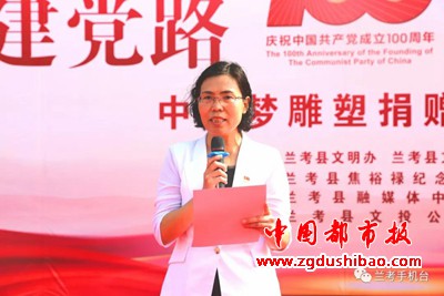 县委常委、宣传部长朱春艳在致辞中表示,今天的中国梦雕塑捐赠仪式是兰考庆祝中国共产党成立100周年系列活动的其中一项,是弘扬爱党爱国爱社会主义的宣传教育形式之一,是艺术家、企业界党员代表颗颗赤子初心的印证,更是各界人士关心、支持兰考发展的具体体现。我们要只争朝夕、不负韶华,把爱党、爱国和爱民之情化为不竭动力,为全面推动乡村振兴凝聚强大力量,以更加优异的成绩向党的百年华诞献礼。