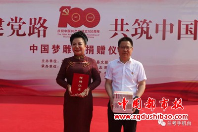 【记者袁宏太】兰考报道:6月26日,由县文明办、县文联主办,县融媒体中心、县焦裕禄纪念园、县文投公司承办的“百年建党路 共筑中国梦”中国梦雕塑捐赠仪式在我县文化交流中心举行,原河南军区副参谋长刘卫国、原河南省统战部副部长刘世军、原开封市宣传部常务副部长武占英,县领导丁向东、朱春艳、张祖金、陈百行、程国勇以及社会各界爱心人士代表等参加活动。