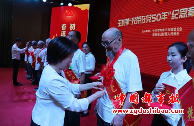 为献礼党的百年华诞,全体党政领导准备了一个特别节目——诗朗诵《新未来 新篇章 新辉煌》,他们声情并茂的演出,深深地感染了在场的党员干部,将演出推向高潮。演出中间,为致敬老党员,激励新党员,任燕侠、禹文强为本镇11名50年以上党龄的老党员代表颁发纪念章,88岁的老党员金福琪分享了王村镇的发展变化,表达了对党和政府的感恩与热爱之情。大会在《没有共产党就没有新中国》合唱中圆满落幕。