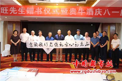 本报讯 (记者袁宏太  通讯员尹中刚 史家治 马红军 王友为) 报道:7月26日下午,王悦旺先生赠书仪式暨贵牛酒庆八一座谈会在郑州市豫鹰宾馆举行。当前全党正在欢庆党的百年华诞,全军正在喜迎建军94周年,目前,郑州市及省内多个地市正在抗洪救灾,恢复重建,党政机关、企事业单位、慈善机构和爱心企业全力以赴恢复正常生活工作秩序,在这个重要历史时刻,举行赠书仪式暨庆八一座谈会,非常有纪念意义。