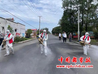 本报讯【记者仓超  通讯员刘广申 陈会敏】河南报道:8月24日上午,矿建街道赵案庄村第一书记刘鑫凯带领龙湖酒店志愿者组成的抗疫消杀队伍,来到矿建街道,对街道办公楼、村庄、学校、主要道路等重点场所进行不留死角的防疫消杀。