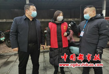 圣谦物业总经理刘建峰和副经理陈彬涛在桃花源小区向社区人员了解志愿者服务情况。