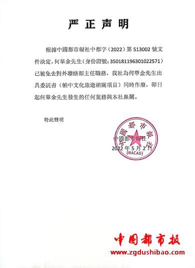 根据中国都市报社中都字(2022)第513002号文档决定,何华金先生(身份证号:350181196301022571)已被免去对外联络部主任职务,我社为何华金先生出具委托书(帕中文化旅游相关项目)同时作废,即日起何华金先生发生的任何业务与本社无关。