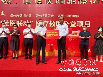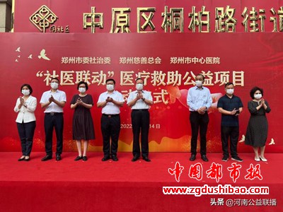 本报讯(首席记者姜德兴)郑州报道:9月14日上午,由郑州市委社治委、郑州慈善总会、郑州市中心医院共同举办的“社医联动”医疗救助公益项目启动仪式在中原区平安街社区党群服务中心举行。郑州慈善总会会长姚待献、郑州市委社治委常务副主任王海江、副主任鲁超祥,中原区委副书记、区长邓英文,区委常委、组织部部长、社治委主任曹勇,市中心医院院长连鸿凯、院纪委书记靳凤梅,郑州慈善总会副会长王合生等领导出席活动。中原区、二七区委社治委,中原区民政局、慈善总会负责人以及50个项目合作社区负责人参加了活动。
