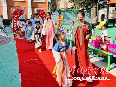 孩子们身穿汉服,园长妈妈和老师首先为孩子们正衣冠,预示“先正衣冠,后明事理”,注重自己的仪容整洁是要上的第一课。一日为师,终身为父,步入学堂要先行拜师礼。“揖深圆拜恭敬”。孩子们拱手,高揖,面向老师行礼,感谢老师启蒙之恩。紧接着,老师带着孩子们走过成长之门,寓意孩子们在返校的第一天元气满满,开开心心,愿孩子们新征程,新起点,迎接新的成长与进步。