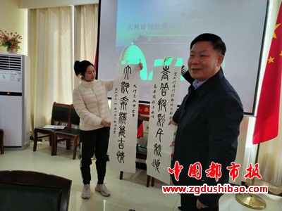 大河诗刊社郑州分社成立暨揭牌仪式上,河南鼎盛建设集团有限公司董事长王小召首先致欢迎词,他对各位诗人、作家的到来表示诚挚的欢迎,对企业与诗人,作家联手开创企业文化新愿景充满期待。随后河南盛鼎建设集团有限公司总经理陈鹏飞,与大诗刊社社长、著名诗人高旭旺,以及与会主要嘉宾一起为大河诗刊社郑州分社揭牌。大河诗刊社社长、著名诗人高旭旺为大河诗刊社郑州分社相关负责同志颁发聘书。与会诗人、作家,也分别以赠送自己创作的书法作品及现场朗诵诗歌或即兴发言的形式,向大河诗刊社郑州分社的成立及揭牌仪式表示祝贺。