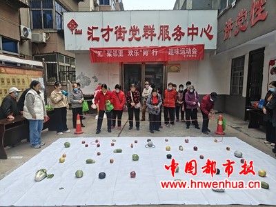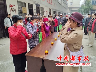 “抢橘大赛”率先点燃气氛,选手们围站在桌子两旁,裁判一声令下,大家眼疾手快抢夺桌子中间的橘子,场上欢声笑语不断,老人们个个精神抖擞,不甘示弱;“喜摘大枣”夹枣比赛考验着大家的手部灵活度,选手们手持筷子,小心翼翼地将盘中的大枣夹至自己的盘子中,神情专注又认真;“谷物大丰收”项目中,两名选手,争分夺秒,将地上摆放的果蔬捡入盆中;居民在“果满圈中”套圈环节,手持套圈瞄准柚子、白菜、南瓜等果蔬,投掷,套中者欢呼雀跃,未中者也不气馁,在一次次尝试中享受乐趣,“老魏,你套中的可以炒上一盘了”居民打趣的对套圈选手说到。