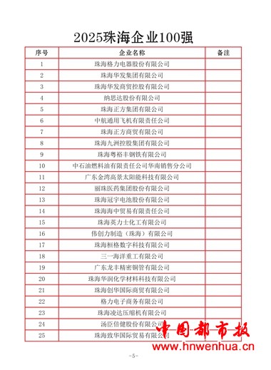 本报讯(记者何冰)珠海报道:11月12日,香山智库企业家大讲堂(99期)--2025年珠海企业100强发展报告发布,华商企业联合网、香山智库企业家论坛组委会联合发布《2025年珠海企业100强发展报告》,报告显示:2025年珠海市100强入围企业主营业务收入均超过10亿,其中格力电器和华发集团主营业务收入连续5年超过1000亿元,再度同登中国企业500强榜单。格力电器以1900.4亿元的营业收入位列第148位。作为空调领域的领头羊,格力电器在传统空调业务保持领先优势的同时,还在冰洗生活电器领域迈上新征程,展现其多元化的战略布局与强大的市场竞争力。华发集团以1521.2亿元营收,位列第285位;新上榜的,还有打印设备和耗材龙头企业纳思达股份有限公司,位列第496名。在2025广东企业500强榜单中,珠海企业上榜13家,排名第五,同比增加2家。