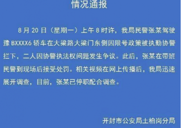 开封:警察怒怼辅警不能协查自己车辆,涉事警察被停职 开封警察违反限号政策闯限行,警察怒怼辅警不能协查自己车辆造成不良影响,涉事警察已被停职配合调查。 8月20日上午8时开封市大梁路大梁门东侧负责该路段的交警中队辅警在协助民警日常执勤中查处理了一辆没有按照限号政策出行的豫B6931~白色jeep越野车。日期:2018-08-23 点击:135221
