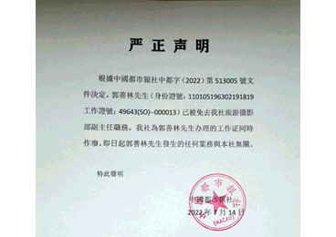 严 正 声 明根据中国都市报社中都字(2022)第513005号文件决定,郭善林先生(身份证号:110105196302191819 工作证号:49643(SO)--000013)已被免去我社旅游摄影部副主任职务,我社为郭善林先生办理的工作证同时作废,即日起郭善林先生发生的任何业务与本社无关。日期:2022-07-14 点击:47723