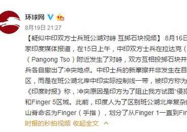 中印士兵班公湖互掷石头疑似现场视频曝光 中印士兵班公湖互掷石头疑似现场视频曝光 8月16日,据《印度时报》等多家印度媒体报道,在15日上午,中印双方士兵在拉达克(Ladakh)地区的班公湖(Pangong Tso)附近发生了对峙,双方互相投掷石块并有人受伤日期:2017-08-20 点击:1602