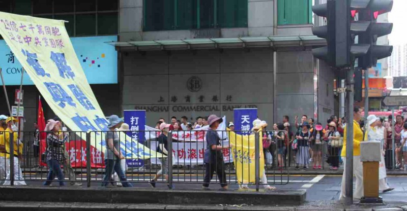 当天,香港和谐友好协会的成员在香港弥敦道打出横幅,“法分子滚出香港”“邪教法分子勿搞乱香港”,字字醒目,看到邪教的游行队伍出现在香港街道,成员用喇叭高喊标语,他们希望通过这种方式向过往行人宣传邪教“法分子”的危害。他们的身影引来了许多过往行人的关注。
