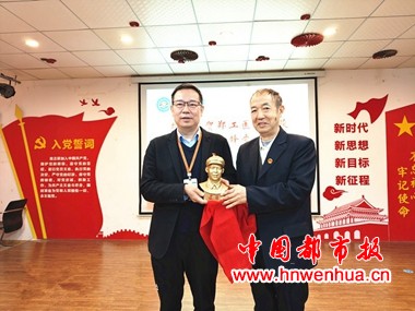 王长安代表中国雷锋报社向郑工社区卫生服务中心赠雷锋同志雕塑像。